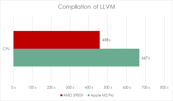 Compiling code is well suited to multiprocessors. It is no surprise that the AMD 3950X is faster than the Apple M2 Pro here.